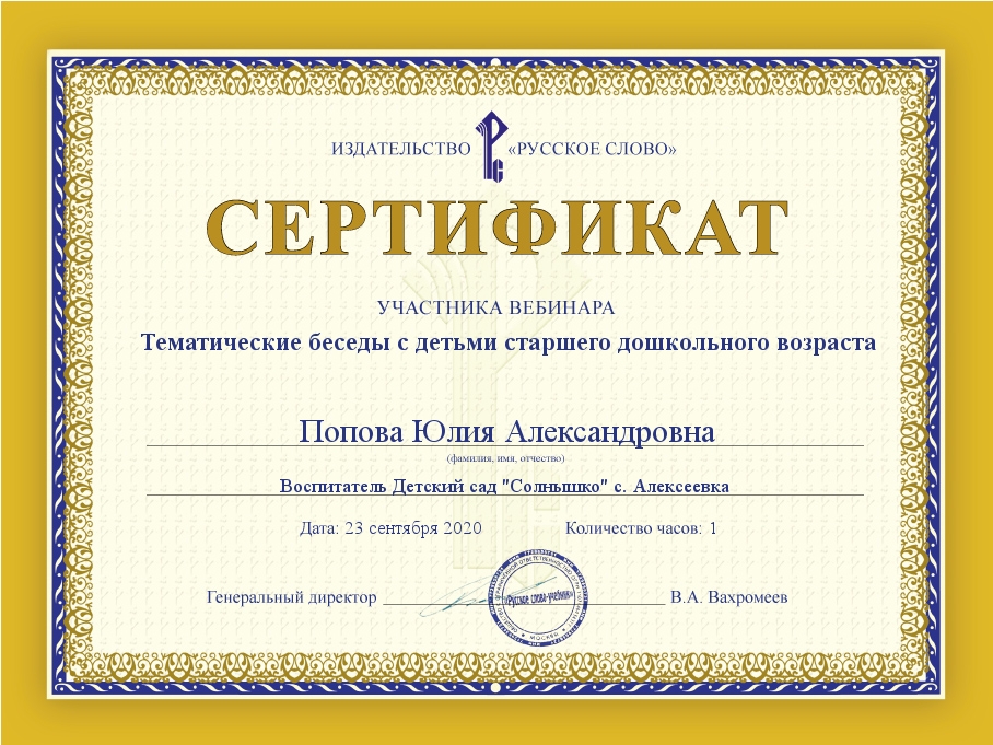 В период самоизоляции педагоги Детского сада "Солнышко" с.Алексеевка,продолжают своё самообразование,в рамках работы Федеральной пилотной площадки по апробации УМК "Мозаичный парк",Галина Петровна Герман, Ольга Ивановна Павлова и Ирина Петровна Ильина , Елена Викторовна Леонтьева стали активными участниками вебинара по очень актуальной теме:"Чем занять ребенка летом?".В ходе работы вебинара пополнили свои знания,которые будут успешно использованы на практике